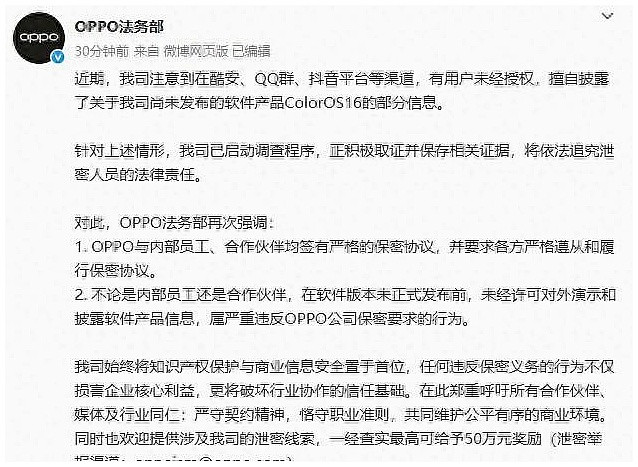 再顺嘴提一句。OPPO这回管得狠。一旦定性为泄密,不管你是内部还是合作方,是谁自己担着。别拿‘我只是搬运’’我也是转发’这种话糊弄。